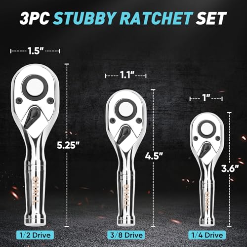 SHALL 3-Piece Stubby Ratchet Set - 1/4'', 3/8'', 1/2'' Mini Drive Ratchet with Storage Box - Quick Release & Reversible Small Ratcheting Handle Set - 72-Tooth, Full Polished, Chrome Alloy Made