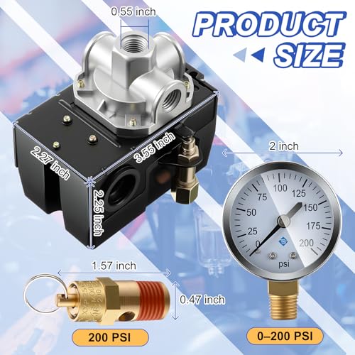 Dreyoo Air Compressor Pressure Switch 135-175 4-Port 20 Amp with 0-200 PSI Gauge and 200 PSI Safety Relief Valve, 1/4" NPT Replacement Pressure Switch Parts for Air Compressor