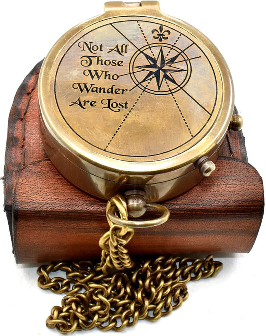 “Not All Those Who Wander are Lost” Engraved Solid Brass Compass with Leather Case & Chain | Vintage Style Pocket Compass for Men & Women | Hiking Compass | Graduatin Gift | Birthday Gift