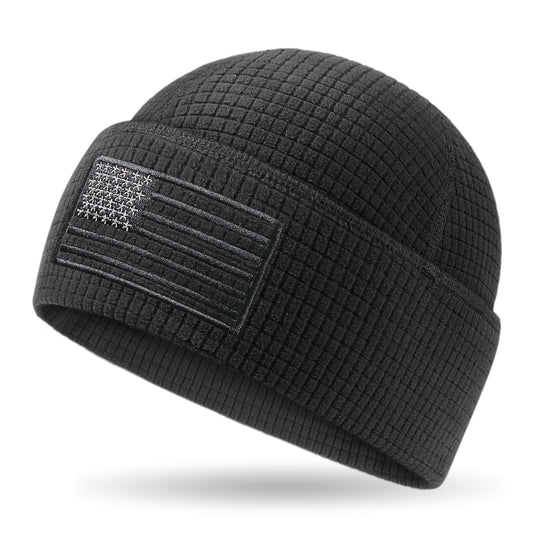 OUTDOOR SHAPING Grid Fleece Cuffed Beanie with American Flag Embroidery, Waffle Tactical Army Military Police Skull Cap Black