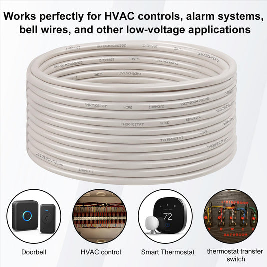 XRDS -RF 18AWG 2 Conductor Thermostat Wire 20FT, Solid Copper, 18 Gauge 2 Wire for Thermostat, HVAC, Heating and Cooling, White Jacket (20FT / 25FT / 30FT / 50FT / 75FT / 100FT)