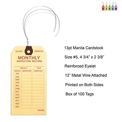 Fire Extinguisher Monthly Inspection Tags - 4 3/4" x 2 3/8" - Box of 100 Manila Service Tags with Wire Ties Attached for Indoor Only