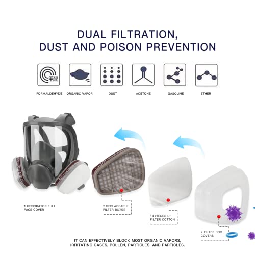 Full Face Respirator Mask Reusable, 19 IN 1 Gas Mask with Filters, for Paint, Against Dust, Decoration, Car Spraying, Sanding, Cutting and Other Work Protection