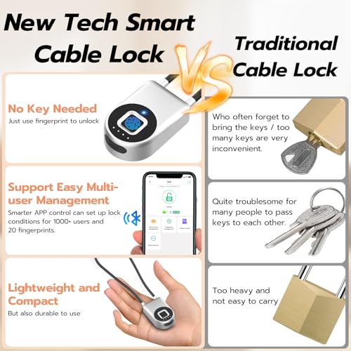 Fingerprint Cable Lock, eLinkSmart Fridge Locks with Bluetooth APP Control, Biometric Smart Padlock for Adults Baby Proof Cabinet Refrigerator French Door Cabinet Gate Locker Bike, 14.9'' Long Silver