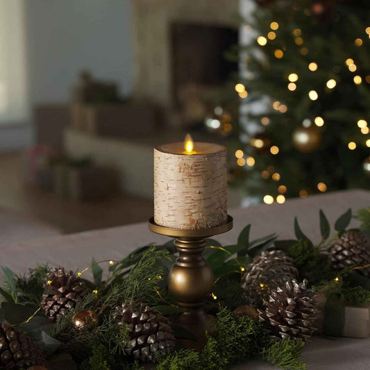 Realistic Moving Flame LED Pillar Candle with Birch Bark - Battery Operated, Remote Ready, 4x7