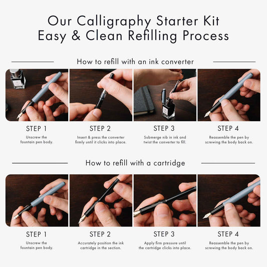Wordsworth and Black Calligraphy Pen Set - Grey - Includes 2 Calligraphy Pens, 18 ML Ink Bottle, 60 Ink Cartridges, Ink Refill Converter, 1 Medium and 4 Broad Nibs, Brush Pen