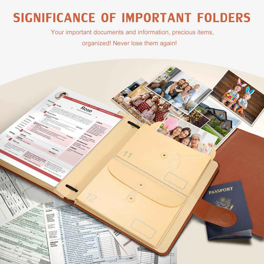 JOYCE Important Document Organizer, Life File Manager with Labels, for Managing Letters, Photos, Birth Certificates, Social Security Cards, Passport, Ring Binder (Brown Leather)