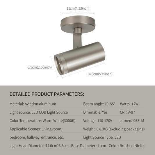 lovuphoria Dimmable Zoomable Spot Lights Indoor Spotlight, 12W Adjustable Angle Ceiling Spotlights for Wall Art Corridor Living Room, Accent Lighting Brushed Nickel Finish - Warm White