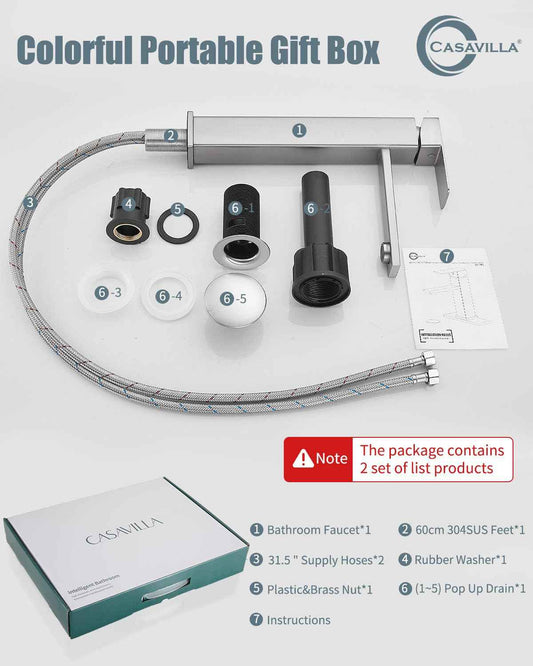 Casavilla Bathroom Faucet(2 Sets), Brushed Bathroom Sink Faucet Set with Pop Up Drain, Single Hole Single Handle High Barrel Sink Vanity, Stainless Steel Lead-Free
