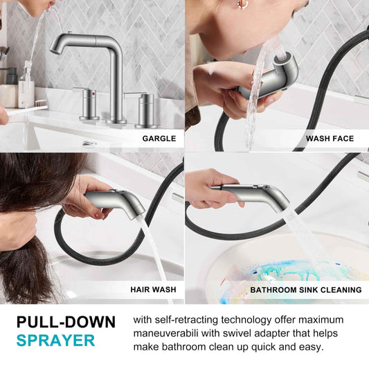 KENES Widespread Bathroom Faucet with Sprayer, Brushed Nickel Bathroom Sink Faucet with Pull Down Sprayer, 8 Inch 3 Hole Pull Out Bathroom Faucet with Pop Up Drain & Supply Lines LJ-9058A