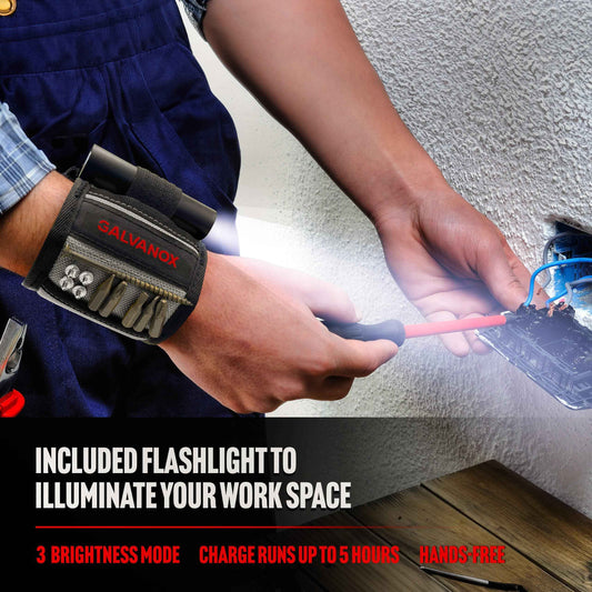 Galvanox Magnetic Wristband with LED Flashlight - Nylon Wrist Magnet for Tools, Screws and Nails with Adjustable Work Light - Great Gift for Men, Father, Handyman (Black)