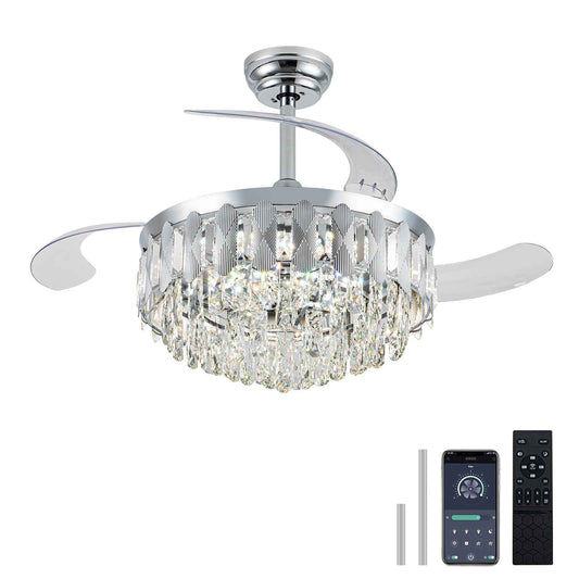 illus illumination 36in Fandelier Ceiling Fans with Light, Modern Crystal Chandelier Ceiling Fans, Remote & APP Control, Retractable Reversible 3 CCT LED Dimmable for Living Room Bedroom (Silver)
