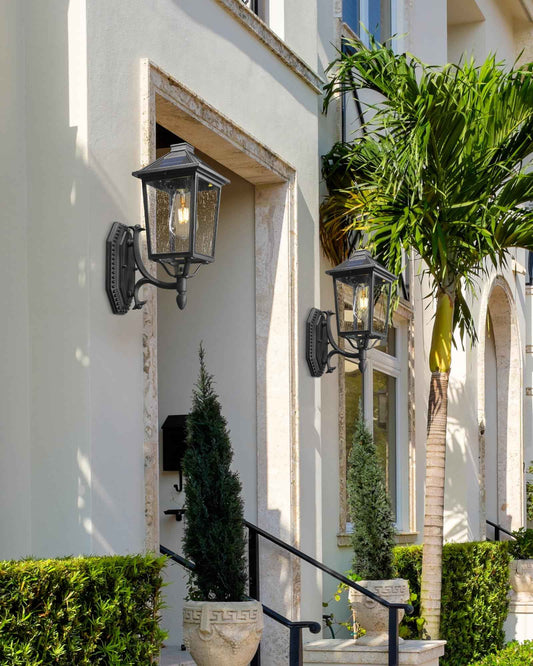 Outdoor Solar Wall Light, HWH Dusk to Dawn Exterior Light Fixture Outside Wall Sconce, Vintage Wall Mounted Porch Lights, Black Finish with Seeded Glass, 5HX107B-SL BK