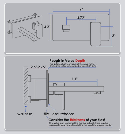 ROVOGO Wall Mount Bathroom Sink Faucet with Rectangular Spout and Rough-in Valve, Single Handle Single Hole Faucet for Bathroom Sink, 304 Stainless Steel, Black