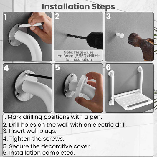 LELYFIT 16-Inch Wall Mounted Shower Seats with Armrests, Space-Saving Foldable Shower Bench for Small Bathrooms, Safety Wall-Mounted Foldable Shower Chair with Reflective Strips, Holds up to 330 lbs