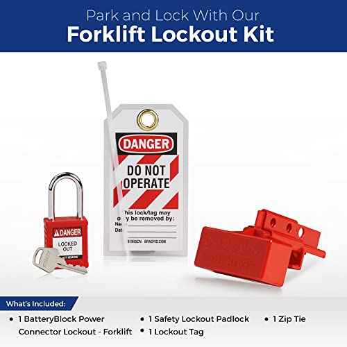 BRADY Lockout Tagout Kit for Industrial Forklift Safety. Electrical Battery Connector Lockout Device, 1 Red Safety Padlock, Loto Tag - 153676