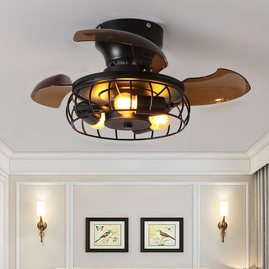BEALWISE 21.6'' Retractable Ceiling Fans with Lights Caged Farmhouse Ceiling Fan Lights with Remote Control and APP, Rustic Industrial Ceiling lamp Black Fixture for Living Room Bedroom Kitchen, A
