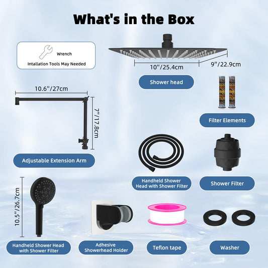 iFealClear Metal Rain Filtered Shower Head, 10” High Pressure Rainfall Shower Head with Handheld Spray, 10 Mode Handheld Powerful Wash, 16" Adjustable Extension Arm, 2 Pack Shower Filters, Matte Black