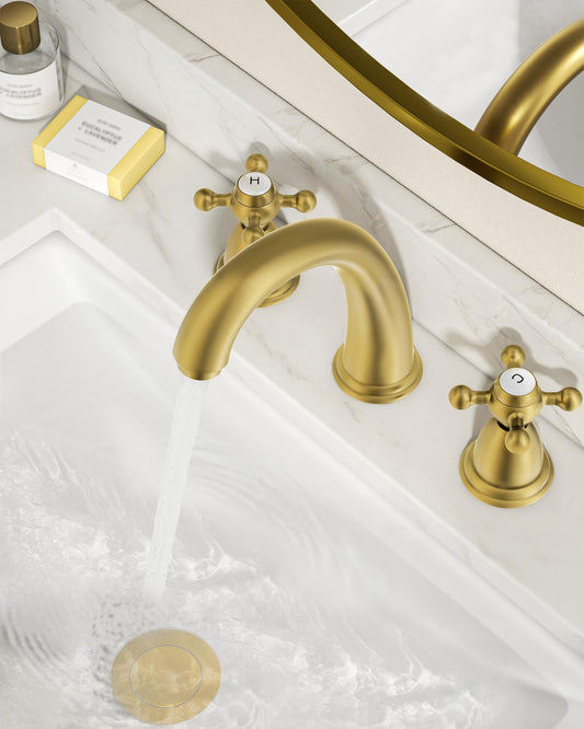 FORIOUS Brushed Gold Bathroom Faucet, Bathroom Sink Faucet 3 Hole with Pop Up Drain and Water Hose Supply, 2 Cross Handle Design, for Vanity RV Farmhouse Sink
