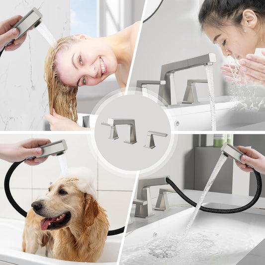 MIAOHUI Brushed Nickel Pull Out Bathroom Faucets 3 Hole, 8 Inch Widespread Bathroom Sink Faucet, Double Handle Vanity Faucet for Bathroom Sink, with Pop-up Drain and Supply Lines