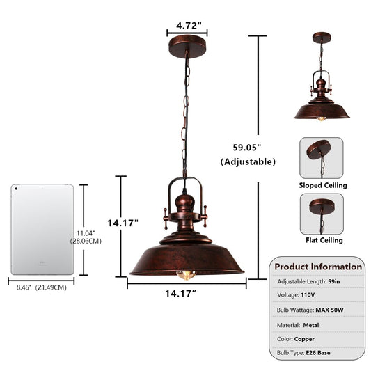 Sedelan Copper Pendant Light, Barn Pendant Lights Kitchen Island, Farmhouse Pendant Lighting, Industial Haning Lamp, Rustic Light Fixtures for Entryway Bedroom Hallway Adjustable Height,E26