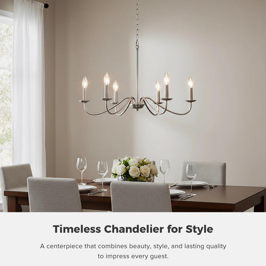 YCZHCC 27.5'' Brushed Nickel Chandelier, 6-Light Farmhouse Chandelier for Dining Room Lighting Fixture, Rustic Industrial Modern Candle Chandelier for Bedroom, Kitchen, Living Room, Foyer, Hallway