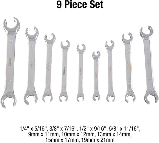 Sunex 9809A Flare Nut Wrench Set - 9-Piece SAE & Metric, Fully Polished with Roll Case