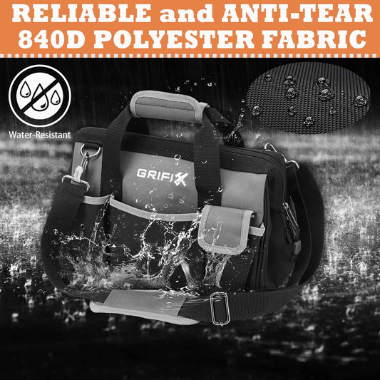 GRIFIX 14-inch Tool Bag, Portable Tool Box Organizer Storage, Wide Mouth Tool Tote Bag with Large Zipper, 14-Pocket Adjustable Shoulder Strap and Ergonomic Handle (14" Standard Base)
