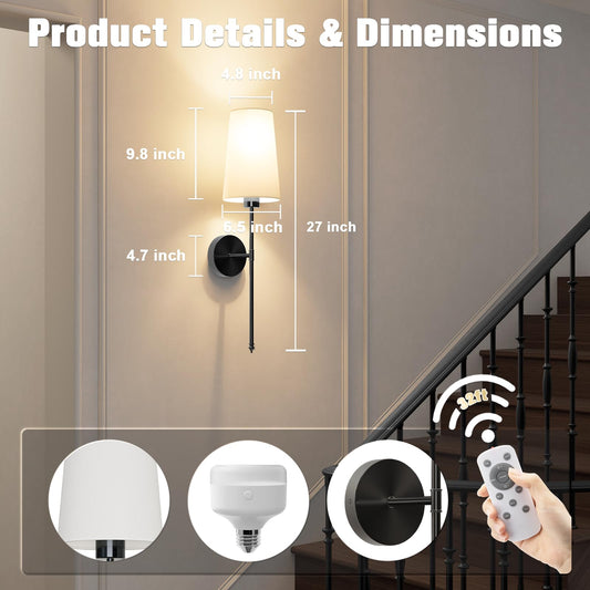 JOFIOS Battery Operated Wall Sconce Set of 2,Black Wireless Wall Sconce with 5200mAh Dimmable Detachable Bulbs and Remote, 10 Colors Rechargeable Sconces Decor for Bedroom Living Room Hallway