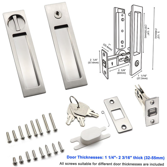 Dontay 2 Pack Pocket Door Handle with Lock and Edge Pull, Narrow Modern Rectangular Keyed Entry Function, Recessed Sliding Door Hardware for 1 3/8” to 2 3/16” Thickness Door (2, Brushed Nickel)
