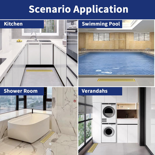 Linear Shower Drain | 24 Inch AISI 304 Stainless Steel Shower Drain, Brushed Gold Linear Drain with Removable Quadrato Grate Cover & Adjustable Feet, Rectangle Floor Drain, in Bathroom Balcony etc