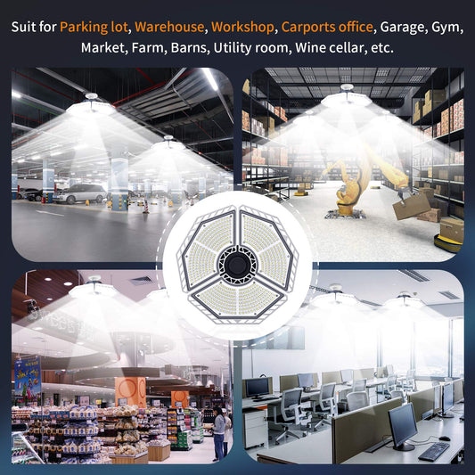 KERNOWO 2 Pack LED Garage Light, 140W 18500 Lumens Lighting, 6000K Daylight With Deformable Three Panels Ceiling Light Fixture E26/E27 Triple Glow LED Shop Light for Basement Workshop