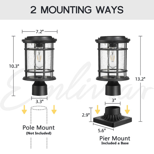 Emliviar 13 Inch Outdoor Solar Post Light, Dusk to Dawn Post Lighting Fixture with Remote Control, Removable Pier Mount with Seeded Glass, XE229P-SL BK