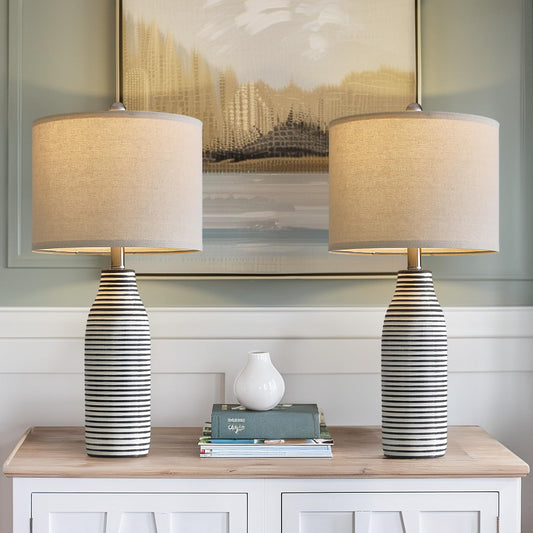 PORTRES 25" Ceramic Table Lamps Set of 2 Beside Lamps for Living Room Modern Bedroom Lamps for Night Stands with Rotary Switch Black and White Stripes