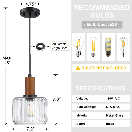 2 Pack 1 Light Industrial Modern Farmhouse Hanging Kitchen Island Pendant Ceiling Light Fixtures,Natural Wood 7.2" Clear Textured Glass Black Finish Over Sink Restaurant bar Corridor