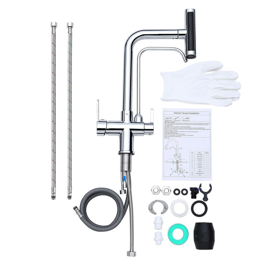 TSIBOMU Dual Handles Kitchen Sink Faucet with Drinking Water Faucet, 3 Way Pull Out Kitchen Faucet with 3-Function Sprayer for Water Filtration System, Chrome