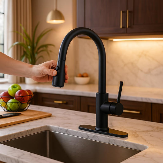 INDARE Matte Black Kitchen Faucet with Pull-Down Sprayer, High Arc Single Handle Stainless Steel Deck Mount Faucet, 1 or 3 Hole Deck Plate Included for Farmhouse Camper Laundry RV Bar