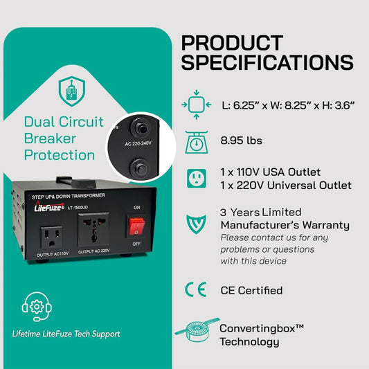 LiteFuze 1500 Watt Voltage Converter Transformer Step Up/Down - 110v to 220v / 220v to 110v Power Converter - Fully USA Grounded Cord - Universal Outlet Socket, 2x US Outlets - CE Certified