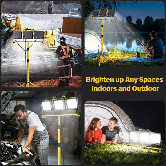 31000 Lumen LED Work Lights with Stand - 3 Head Portable Work Lights with 16.5FT Cords - IP66 Waterproof Foldable Tripod Work Lamp for Outdoor Indoor Job Site Construction Garage Site Lighting (6500K)
