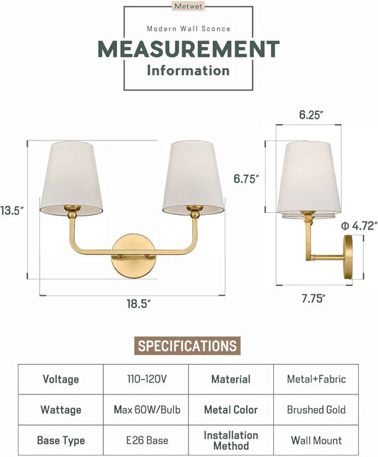 Brushed Gold 2-Light Bathroom Vanity Sconce with White Fabric Shade - Modern Wall Lighting for Hallway & Bedroom, Model VL837-BG