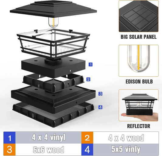 Solar Post Cap Lights 8-Pack - Adjustable Brightness Warm White, IP64 Waterproof, Vintage Edison Bulbs for 4x4, 5x5, 6x6 Fence & Deck Posts - Black