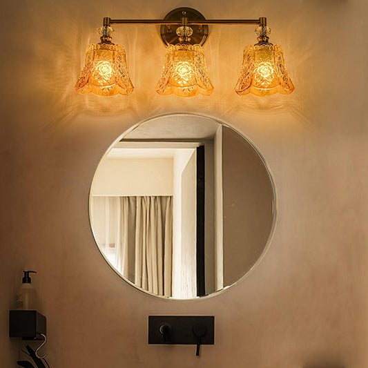 sunkryster Gold Vintage Bathroom Vanity Light Fixture, 3-Light Bathroom Lighting Gold Finish with Amber Glass Shade, Retro Brushed Gold Vanity Light for Bathroom