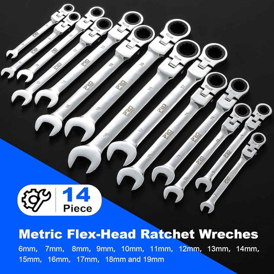 14-Piece Metric Ratcheting Wrench Set - Flex-Head, 72 Tooth, Cr-V Steel with Storage Case (6-19mm)