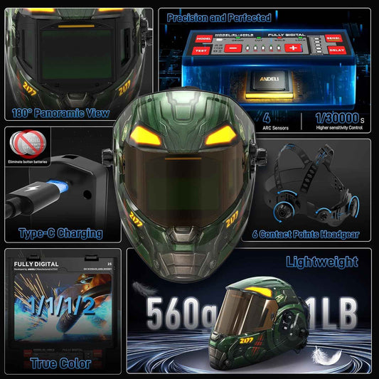 ANDELI Auto Darkening Welding Helmet - 180° Panoramic View, Solar & Rechargeable, True Color Shade 4/5-9/9-13