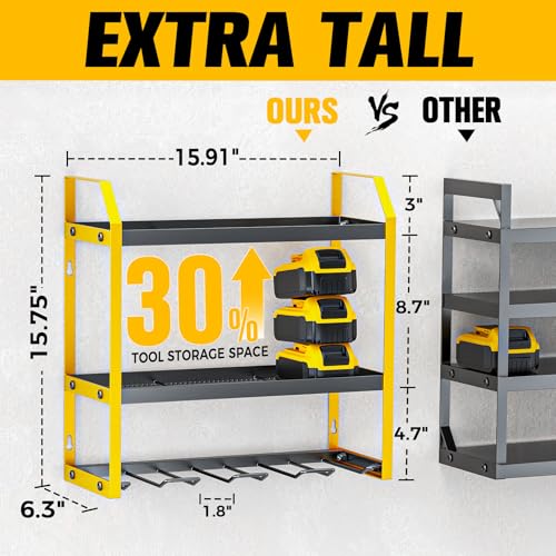 Power Tool Organizer Wall Mount with Extra Drill Holder, Yellow & Black Garage Storage Combo with Battery Storage, 4 Drill Slots Total, Heavy Duty Steel Tool Rack for Workshop Garage