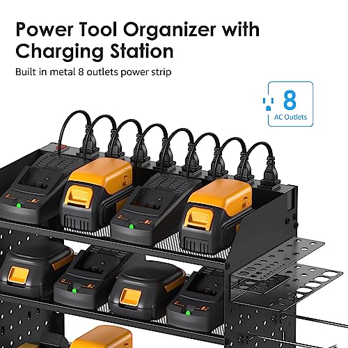 CCCEI Modular Pegboard Rack Power Tool Organizer with Charging Station. 4 Layer Wall Mount Drill Holder, Mechanic Tool Battery Charger Organizer. Garage Shop Storage Utility Shelf with Power Strip.