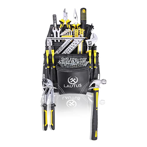 LAUTUS Oil Tanned Leather Tool Pouch Bag | Black | Carpenter, Construction, Framers, Handyman | 10 Pockets, 2 Hammer Holders | 100% Leather
