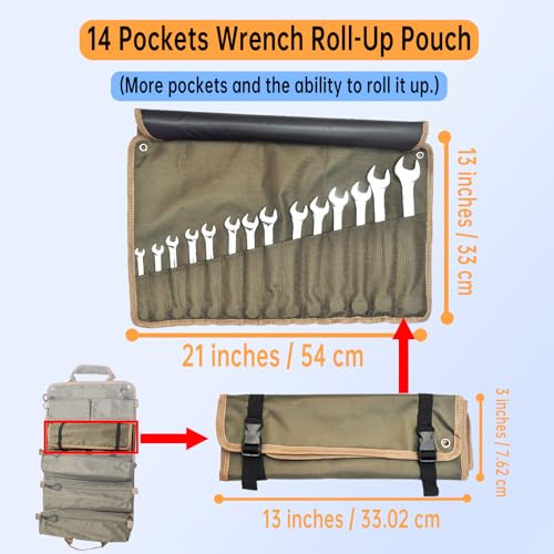 Tool Roll Up Bag, Large Tool Bag Organizer for Electrician, Heavy Duty Detachable with 3 Big Tool Pouches, 1 14-pocket Wrench Organizer, 2 Small Storage Tool Bag, Gift for Men/Dad/Him