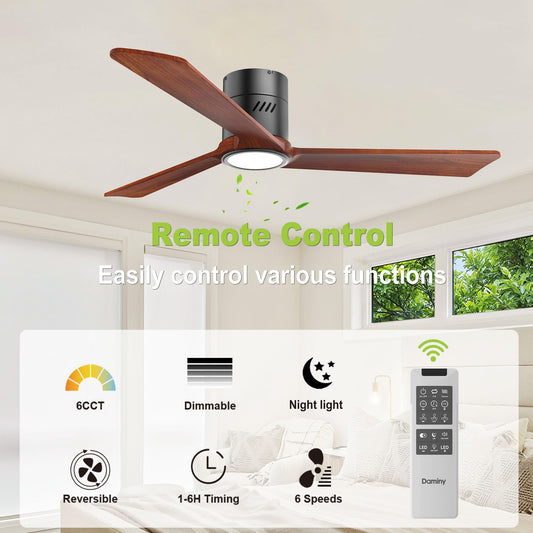 DAMINY Natural Solid Wood 52 inch Ceiling Fan with Light,3 Blades,6CCT,Black Low Profile Ceiling Fan with Light and Remote Control,APP Control,Flush Mount