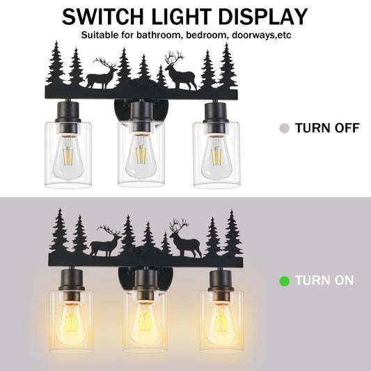 Monyohame Farmhouse Rustic Deer Bathroom Light Fixtures, 3-Light Black Vanity Lights with Clear Glass Shade, Wall Lamp for Bathroom, Living Room, Hallway, Kitchen, Cabnet, Porch